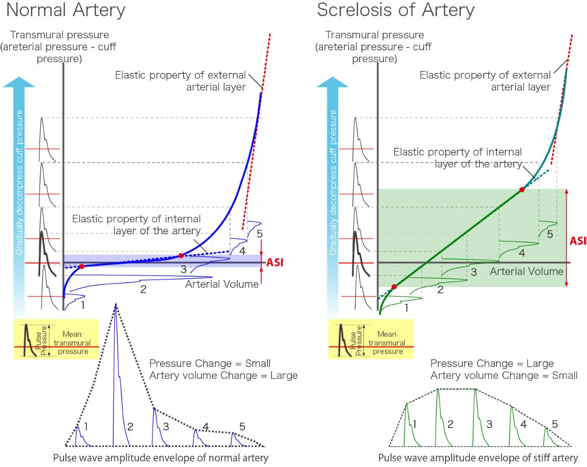 ASI measures whether the vascular system is functioning normally without any limitations due to health risks. Arterial stiffness due to medial calcification and reduced elasticity caused by aging is the most critical factor contributing to increase in ASI. Unlike other measuring principles for arterial stiffness, ASI allows efficient assessment of arterial stiffness directly under a cuff, thus making it e a useful index for assessing arterial stiffness in each extremity.